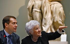 Первый заместитель председателя Правительства России Дмитрий Медведев (слева) и директор Государственного музея изобразительных искусств (ГМИИ) имени А.С.Пушкина Ирина Антонова (справа) на заседании попечительского совета фонда Государственного музея изобразительных искусств (ГМИИ) им. А.С.Пушкина, на которым был представлен проект "Музейного городка". Заседание прошло в зале "Микельанджело" ГММИ им. А.С.Пушкина.