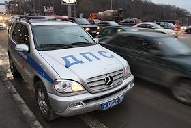 Автомобиль "Мерседес" Дорожно-патрульной службы (ДПС) Министерства внутренних дел (МВД) России на улице города.