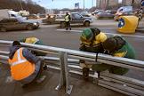 Дорожные рабочие устанавливают ограждения, разделяющие тротуар и проезжую часть.