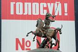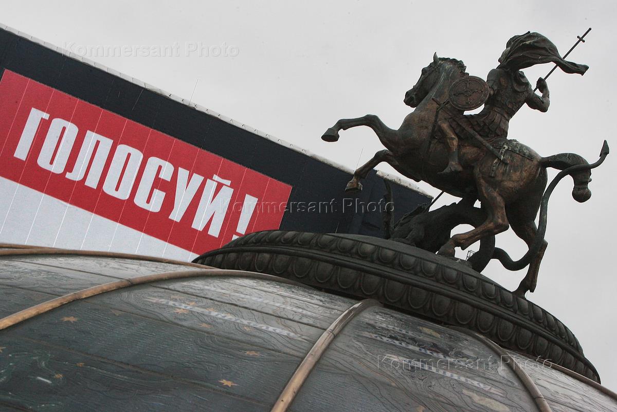 Скульптура Георгия Победоносца на куполе торгового комплекса "Охотный ряд" на Манежной площади на фоне предвыборного плаката "Голосуй!".
