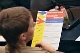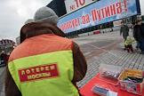 Предвыборный плакат партии "Единая Россия" "Москва голосует за Путина!" на строящемся здании гостиницы "Москва" на Манежной площади. Продавец моментальной лотереи.