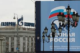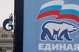 Предвыборный плакат партии "Единая Россия" на фоне эмблемы Газпрома.