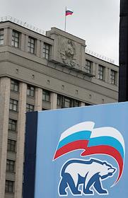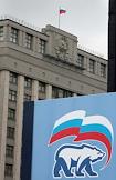 Предвыборный плакат партии "Единая Россия" на фоне здания Государственной Думы России на улице Охотный ряд.