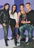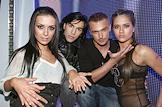 Дуэт "БиС" (Дмитрий Бикбаев (второй слева) и Всеволод Соколовский (второй справа) и телеведущая Яна Чурикова (справа) на финальном концерте проекта "Фабрика Звезд- 7" в спортивном комплексе "Олимпийский".