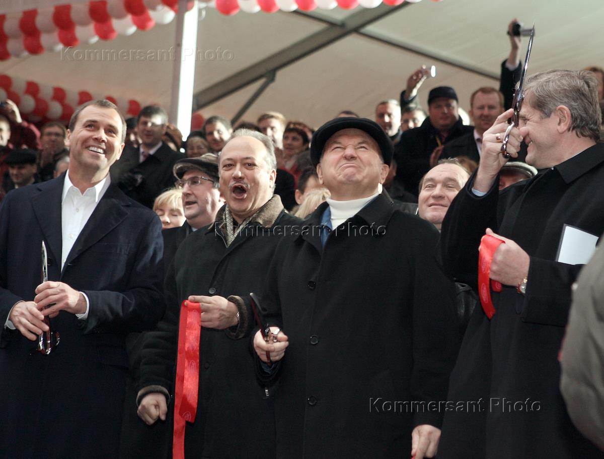 Генеральный директор холдинга "Объединенные кондитеры" Артем Кузнецов (слева), первый заместитель мэра в правительстве Москвы, руководитель комплекса экономической политики и развития города Юрий Росляк (второй слева), мэр Москвы Юрий Лужков (второй справа) и председатель совета директоров холдинга "Объединенные кондитеры" Сергей Носенко (справа) на торжественной церемонии открытия нового производственного корпуса фабрики "Красный Октябрь" на территории Кондитерского концерна "Бабаевский".