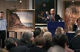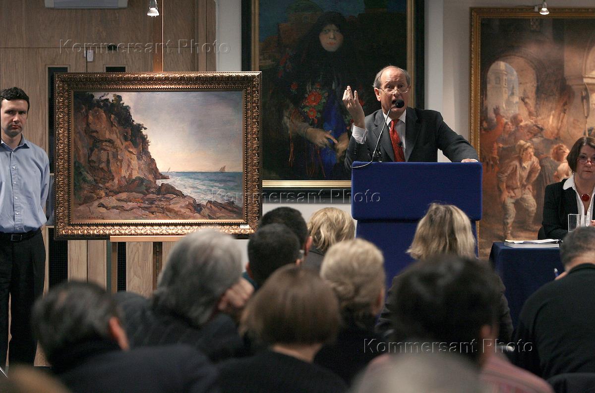 Аукционист Чарли Росс (справа) во время торгов британского дома "MacDougalls", в рамках проведения русской недели в Лондоне. ТОрги картины русского художника Петра Кончаловского "Скалы паруса".