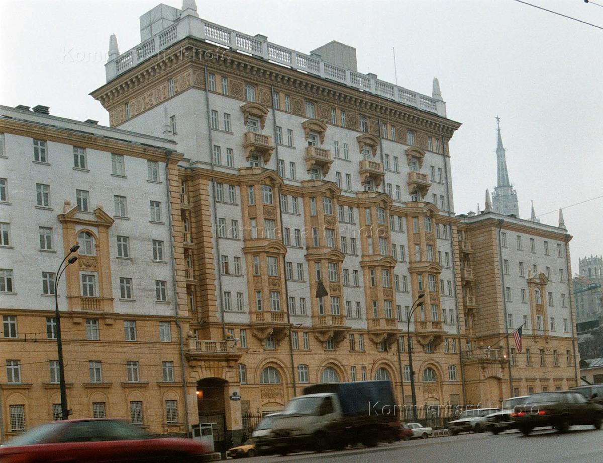 A rally held at the US Embassy in Moscow to protest NATO air strikes in Yugoslavia. A protester writes on the pavement in front of the Embassy window an obscenity.
