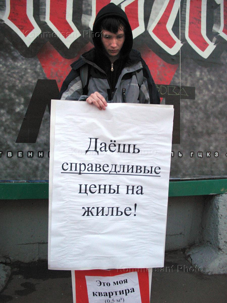 Young man holding a poster that reads "Realty prices must be fair!" near "Serpukhovskaya" metro station.
