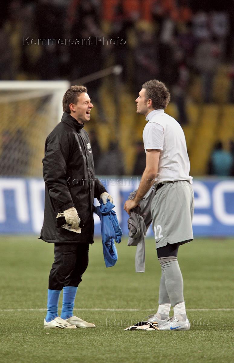 Кубок УЕФА 2007/2008. Матч между командами "Спартак" (Москва, Россия) и "Цюрих" (Швейцария).Вратарь Спартака Стиппе Плетикоса (справа). Матч прошел на Большой спортивной арене (БСА) "Лужники". Счет встречи 1 : 0 в пользу "Спартака".