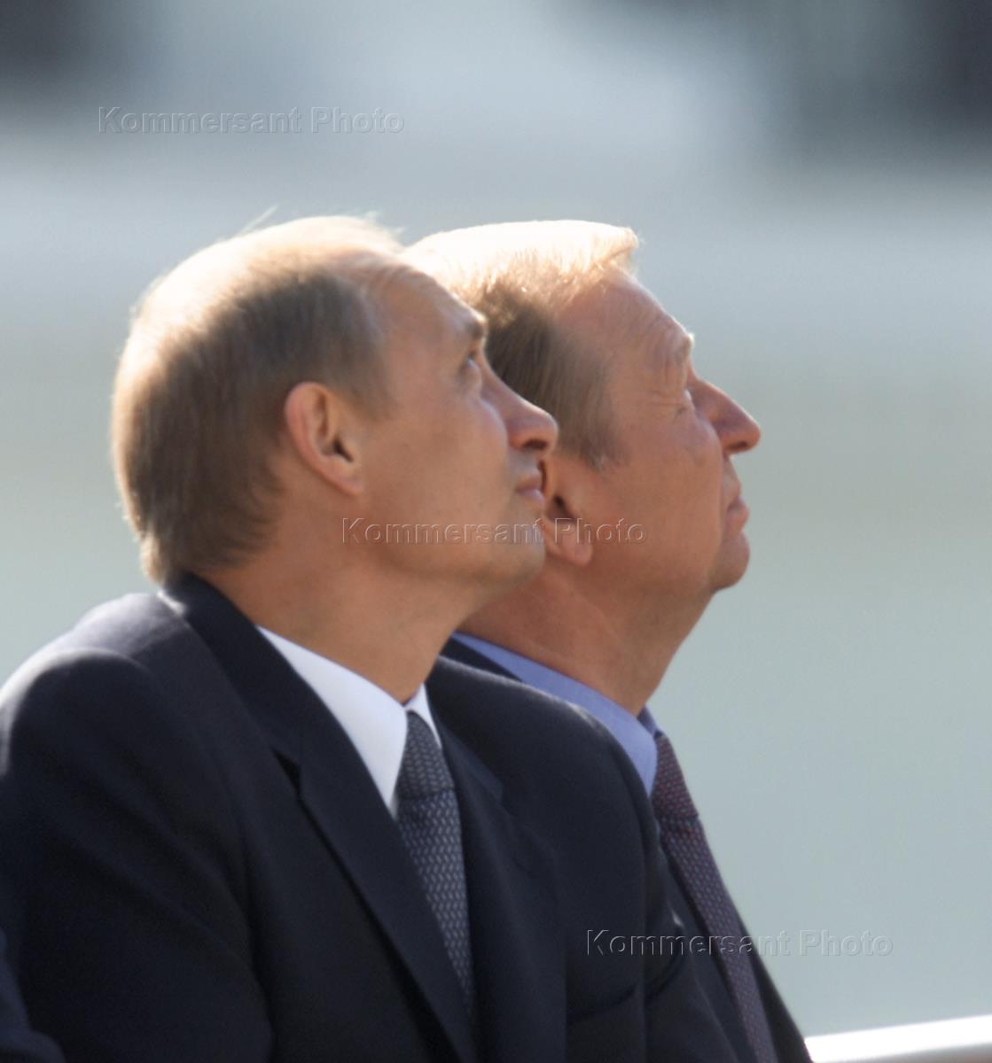 Presidents Vladimir Putin of Russia (left) and Leonid Kuchma of Ukraine (right) watch the performance of the Ukrainian Air Force military jets during the military parade organised in Kiev to celebrate the 10th anniversary of Ukraine's independence. The parade took place in Kreshchatik - the main street of the city.