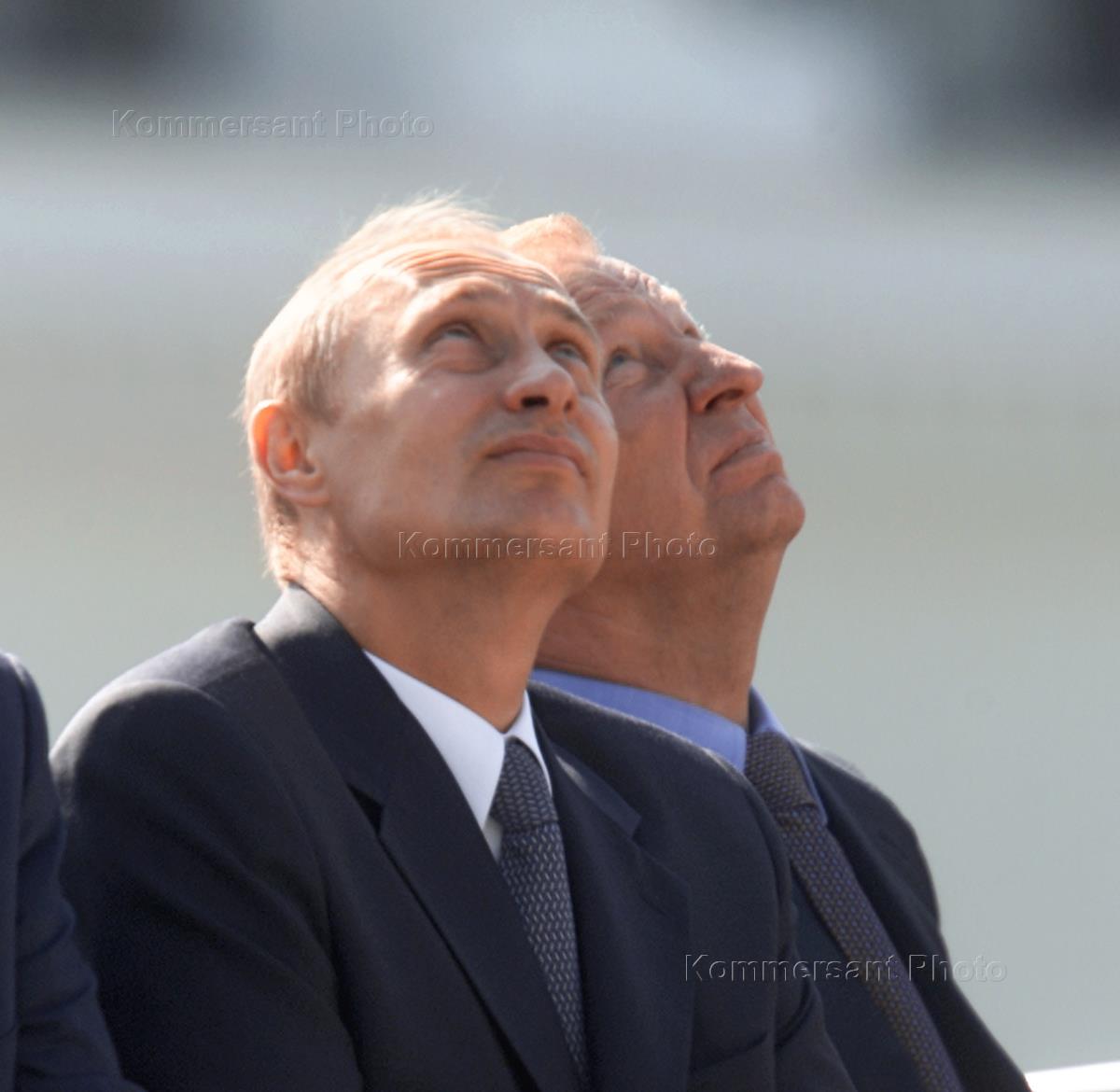 Председатель Верховной Рады Украины Иван Плющ (слева) и Президент России Владимир Путин (справа) на военном параде, посвященном 10-летию независимости Украины. Парад состоялся на центральной площади города - Крещатике.