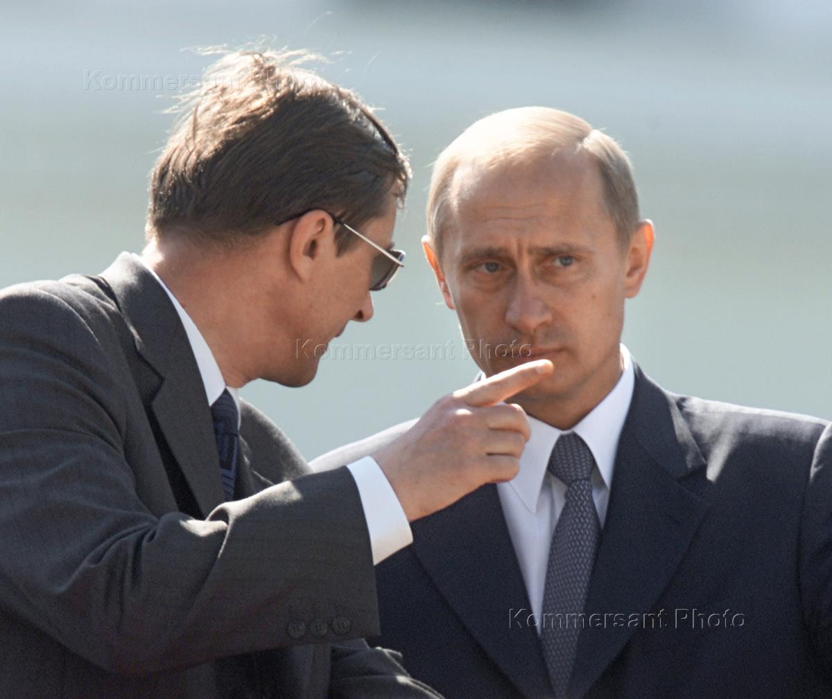 Президент России Владимир Путин (слева) и Президент Украины Леонид Кучма (справа) разговаривают во время проведения военного парада, посвященного 10-летию независимости Украины. Парад состоялся на центральной площади города - Крещатике.