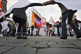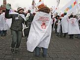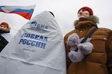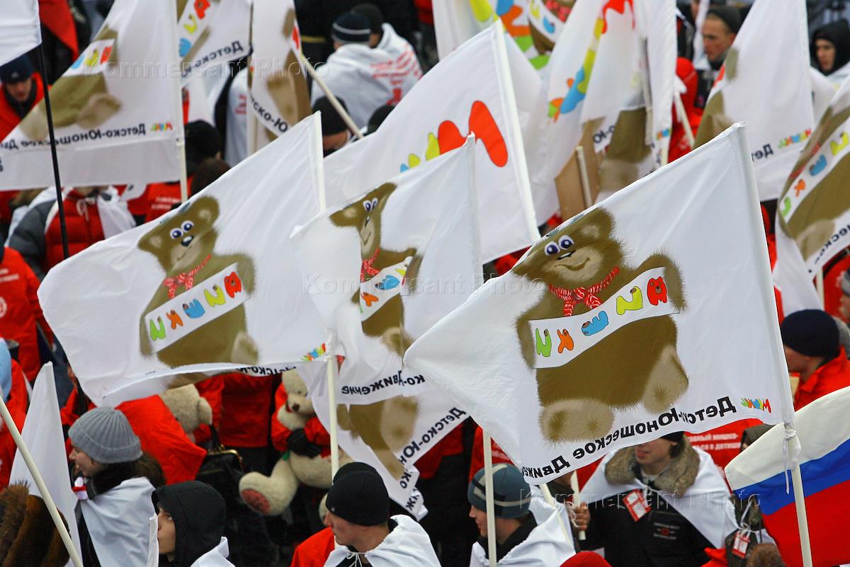 Участники молодежного движения "Наши" во время многотысячной акции, на которой поздравили партию "Единая Россия" с победой на выборах депутатов Государственной Думы России V-ого созыва. Акция прошла на Васильевском спуске.