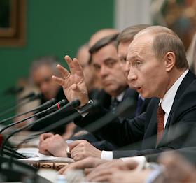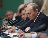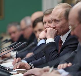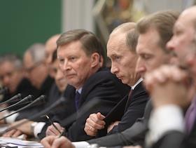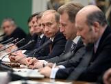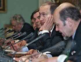 Президент России Владимир Путин (третий справа), первый заместитель председателя Правительства России Сергей Иванов (четвертый справа) и помощник Президента России Игорь Шувалов (второй справа) на встрече с представителями Торгово-Промышленной Палаты. Встреча прошла в здании Торгово-промышленной палаты (ТПП) России.