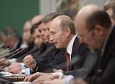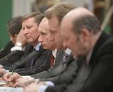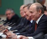 Президент России Владимир Путин (второй справа) и первый заместитель председателя Правительства России Сергей Иванов (третий справа) на встрече с представителями Торгово-Промышленной Палаты. Встреча прошла в здании Торгово-промышленной палаты (ТПП) России.