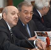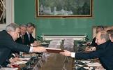Председатель Торгово-промышленной палаты России (ТПП РФ) Евгений Примаков (справа) на встрече Президента России с представителями ТПП РФ. Встреча прошла в здании Торгово-промышленной палаты.