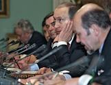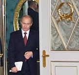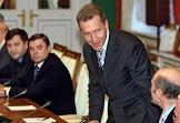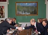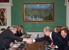 Председатель Торгово-промышленной палаты России (ТПП РФ) Евгений Примаков (слева), Президент России Владимир Путин (второй справа) и первый заместитель председателя Правительства России Сергей Иванов (справа) на встрече с представителями Торгово-Промышленной Палаты. Встреча прошла в здании Торгово-промышленной палаты (ТПП) России.