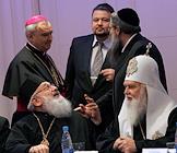 Верховный Архиепископ Украинской греко-католической церкви (УГКЦ), Кардинал Любомир Гузар (слева внизу), Патриарх Киевский и всея Руси-Украины, Украинской Православной Церкви Киевского Патриархата (УПЦ КП) Филарет (Денисенко) (справа снизу), председатель Совета раввинов Еврейской Конфедерации Украины Яков Блайх (справа второй ряд) и заместитель Председателя Конференции епископов РКЦ Украины, епископ-ординарий Луцкой диецезии Римско-католической церкви Маркиян Трофимяк (слева второй ряд) во время совета руководителей религиозных конфессий Украины.