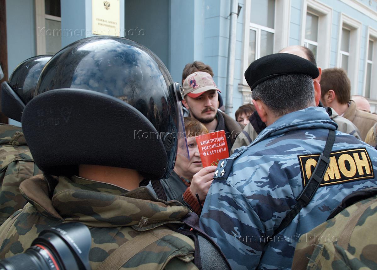 Участники митинга по защите Конституции России и бойцы ОМОНа.