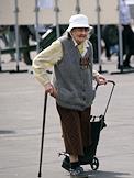Пожилая женщина с сумкой на колесиках идет по площади.
