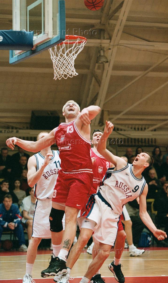 A fight around a basket during a basketball game between Russian and Polish teems for a Europe's Cup.
