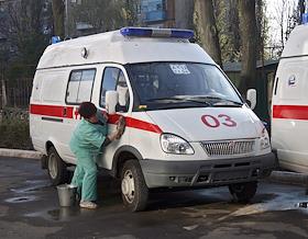 Медсестра моет автомобиль "Скорой помощи" во дворе Азовской городской клинической больницы.