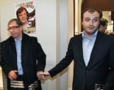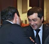 Заместитель руководителя администрации Президента России Владислав Сурков (слева) и главный редактор газеты "Коммерсантъ" Андрей Васильев (справа) на презентация нового диска "Веселые картинки" Игоря Бутмана. Презентация прошла в "Bosco Bar".