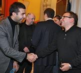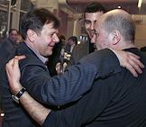 Председатель Телерадиовещательной организации Союза России и Белоруссии Игорь Угольников (слева) и фигурист Роман Костомаров (справа) на презентация нового диска "Веселые картинки" джазмена Игоря Бутмана. Презентация прошла в "Bosco Bar".