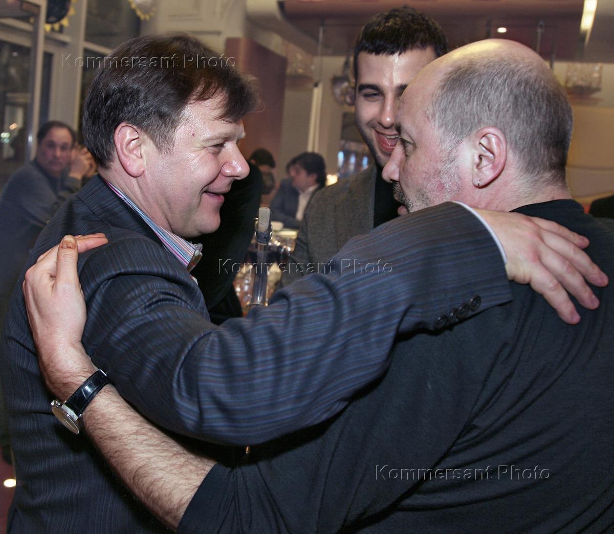 Бизнесмен Ваге Енгибарян (слева) и заместитель руководителя администрации Президента России Владислав Сурков (справа) на презентация нового диска "Веселые картинки" джазмена Игоря Бутмана. Презентация прошла в "Bosco Bar".