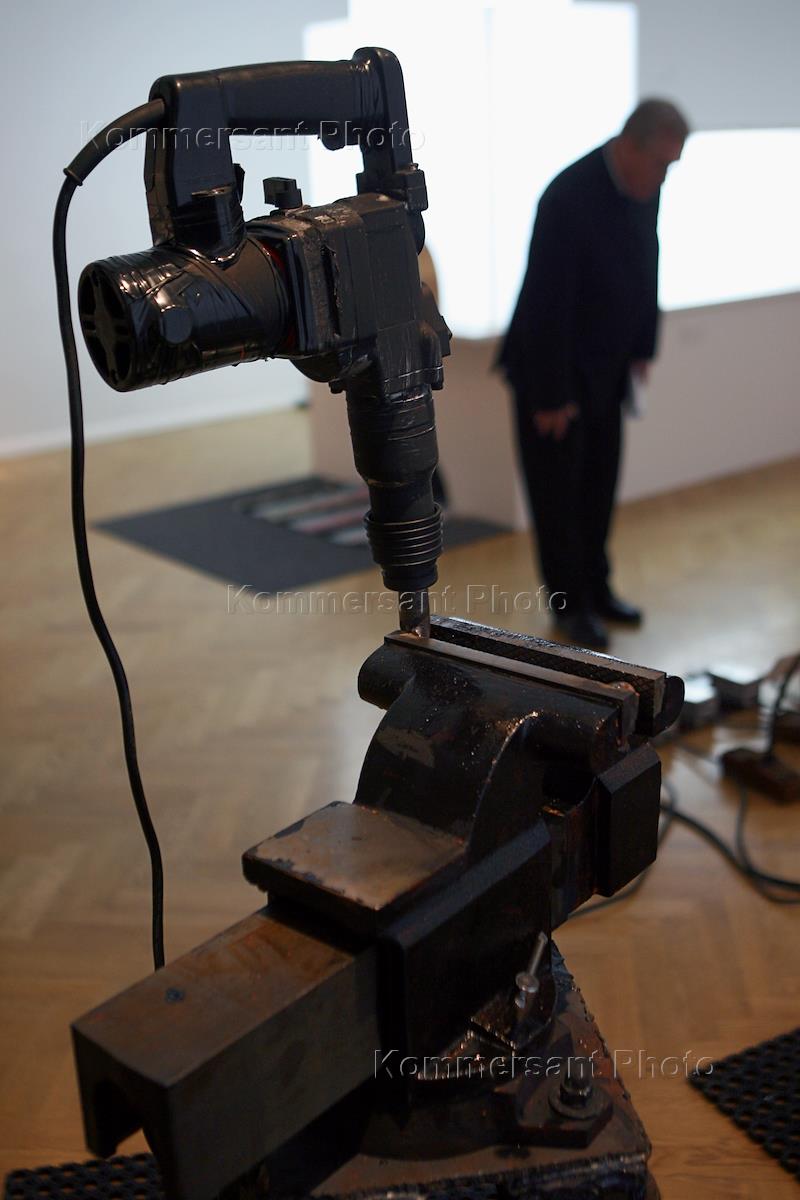 Руководитель Федерального агентства России по культуре и кинематографии Михаил Швыдкой (слева) и руководитель креативного совета СПС, член правления РАО "ЕЭС" Леонид Гозман (справа) на церемонии открытия выставки современного искусства "Стихия света" в Государственном центральном музее современной истории России.