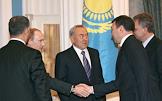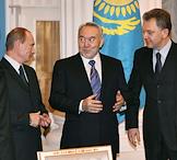 Президент России Владимир Путин (слева), президент Казахстан Нурсултан Назарбаев (в центре) и министр промышленности и энергетики России Виктор Христенко (справа) во время церемонией подписания соглашения между Правительствами России, Казахстана и Туркменистана о сотрудничестве в строительстве Прикаспийского газопровода. Церемония подписания и пресс-конференция прошли в Кремле.