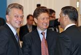 Министр промышленности и энергетики России Виктор Христенко (слева) и председатель правления ОАО "Газпром" Алексей Миллер (в центре) во время церемонией подписания соглашения между Правительствами России, Казахстана и Туркменистана о сотрудничестве в строительстве Прикаспийского газопровода. Церемония подписания и пресс-конференция прошли в Кремле.