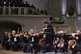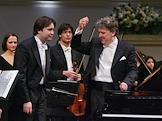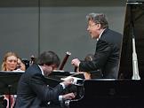 Пианист Алексей Володин (в центре) во время концерта с Российским национальным оркестром под управлением дирижера Василия Синайского (справа). Концерт прошел в Концертном зале имени П.И.Чайковского.