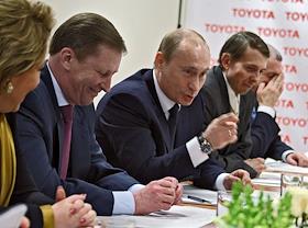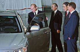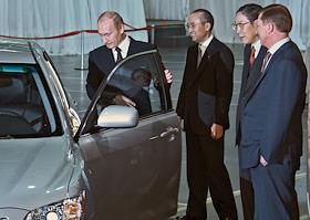 Президент России Владимир Путин (слева), президент компании "Toyota Motor Corporation" Кацуяки Ватанабэ (второй слева), член совета директоров, старший советник "Toyota Motor Corporation" Хироши Окуда (второй справа) и первый заместитель председателя Правительства России Сергей Иванов (справа) во время посещения нового филиала завода японской компании "Toyota" (Тойота) в пригороде Санкт-Петербурга Шушары, где начался выпуск автомобилей "Toyota" "Camry".