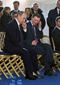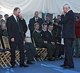 Президент России Владимир Путин (слева) и первый заместитель председателя Правительства России Сергей Иванов (справа) на церемонии закладки нового завода по производству штампованных автомобильных комплектующих и сервисного металлоцентра на территории промышленной зоны "Ижорские заводы". Главный инвестор проекта – "Магнитогорский металлургический комбинат" (ММК).