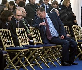 Губернатор Санкт-Петербурга Валентина Матвиенко (справа) и Председатель совета директоров ОАО "Магнитогорский металлургический комбинат" (ММК) Виктор Рашников (слева) на церемонии закладки нового завода по производству штампованных автомобильных комплектующих и сервисного металлоцентра на территории промышленной зоны "Ижорские заводы". Главный инвестор проекта – "Магнитогорский металлургический комбинат" (ММК).