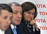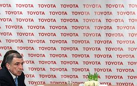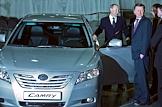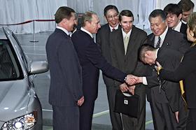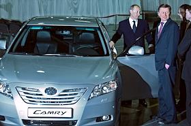 Президент России Владимир Путин (слева), президент компании "Toyota Motor Corporation" Кацуяки Ватанабэ (в центре) и первый заместитель председателя Правительства России Сергей Иванов (справа) во время посещения нового филиала завода японской компании "Toyota" (Тойота) в пригороде Санкт-Петербурга Шушары, где начался выпуск автомобилей "Toyota" "Camry".