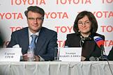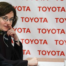 Министр экономического развития и торговли России Эльвира Набиуллина (справа) во время церемонии открытия нового филиала завода японской компании "Toyota" (Тойота) в пригороде Санкт-Петербурга Шушары, где начался выпуск автомобилей "Toyota" "Camry".