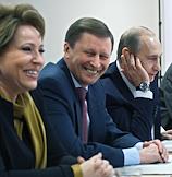 Президент России Владимир Путин (справа), губернатор Санкт-Петербурга Валентина Матвиенко (слева) и первый заместитель председателя Правительства России Сергей Иванов (в центре) во время посещения нового филиала завода японской компании "Toyota" (Тойота) в пригороде Санкт-Петербурга Шушары, где начался выпуск автомобилей "Toyota" "Camry".