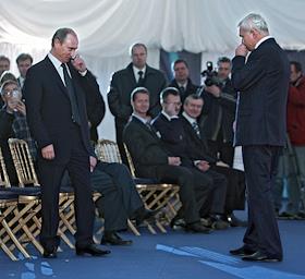 Президент России Владимир Путин (слева), председатель совета директоров ОАО "Магнитогорский металлургический комбинат" (ММК) Виктор Рашников (в центре) и первый заместитель председателя Правительства России Сергей Иванов (справа) на церемонии закладки нового завода по производству штампованных автомобильных комплектующих и сервисного металлоцентра на территории промышленной зоны "Ижорские заводы". Главный инвестор проекта – "Магнитогорский металлургический комбинат" (ММК).