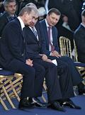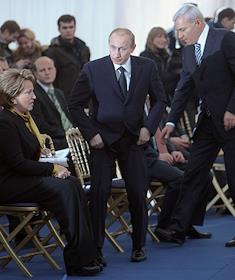 Губернатор Санкт-Петербурга Валентина Матвиенко (слева), Президент России Владимир Путин (в центре) и председатель совета директоров ОАО "Магнитогорский металлургический комбинат" (ММК) Виктор Рашников (справа) на церемонии закладки нового завода по производству штампованных автомобильных комплектующих и сервисного металлоцентра на территории промышленной зоны "Ижорские заводы". Главный инвестор проекта – "Магнитогорский металлургический комбинат" (ММК).