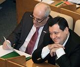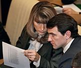 Депутаты Государственной Думы России от фракции "Единая Россия" Владимир Колесников (слева) и Галина Карелова (справа) во время первого организационного заседания Госдумы V-ого созыва.
