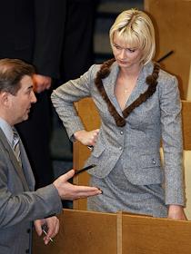 Депутаты Государственной Думы России от фракции "Единая Россия" Татьяна Яковлева (слева) и Франц Клинцевич (справа) во время первого организационного заседания Госдумы V-ого созыва.