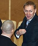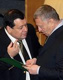 Депутат Государственной Думы России от фракции "Единая Россия" Андрей Макаров (слева) и лидер Либерально-демократической партии России (ЛДПР) Владимир Жириновский (справа) во время первого организационного заседания Госдумы V-ого созыва.