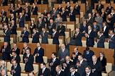 Депутаты Государственной Думы России от фракции "Единая Россия" Иосиф Кобзон (второй ряд слева), Алина Кабаева (второй ряж в центре), Валерий Прозоровский (второй ряд справа), Валерий Комиссаров (первый ряд слева), Виталий Шуба (первый ряд в центре) и Артур Чилингаров (первый ряд справа) во время первого организационного заседания Госдумы V-ого созыва.