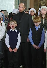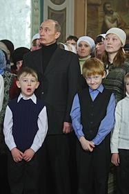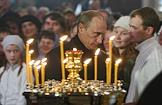 Президент России Владимир Путин (справа) на Рождественском богослужении в Прокопьевском соборе во время своего визита в Велий Устюг.