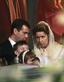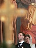 Всенощное бдение и Божественная литургия в Храме Христа Спасителя. Первый заместитель председателя Правительства России Дмитрий Медведев с супругой Светланой во время патриаршего служения в праздник Рождества Христова.