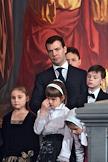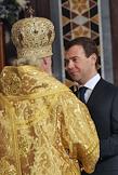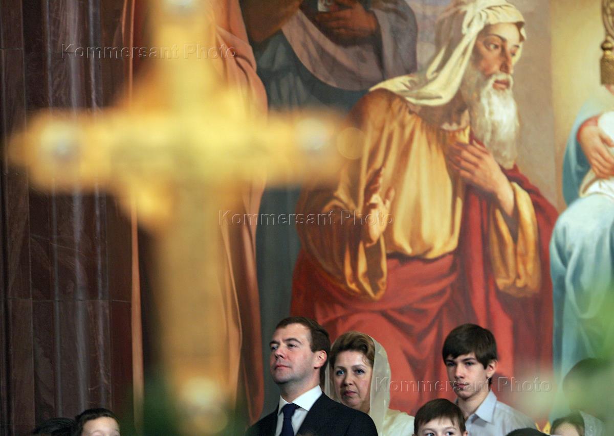 Праздник Рождества Христова. Первый заместитель председателя Правительства России Дмитрий Медведев (в центре) во время Божественной литургии в Храме Христа Спасителя.