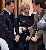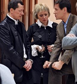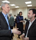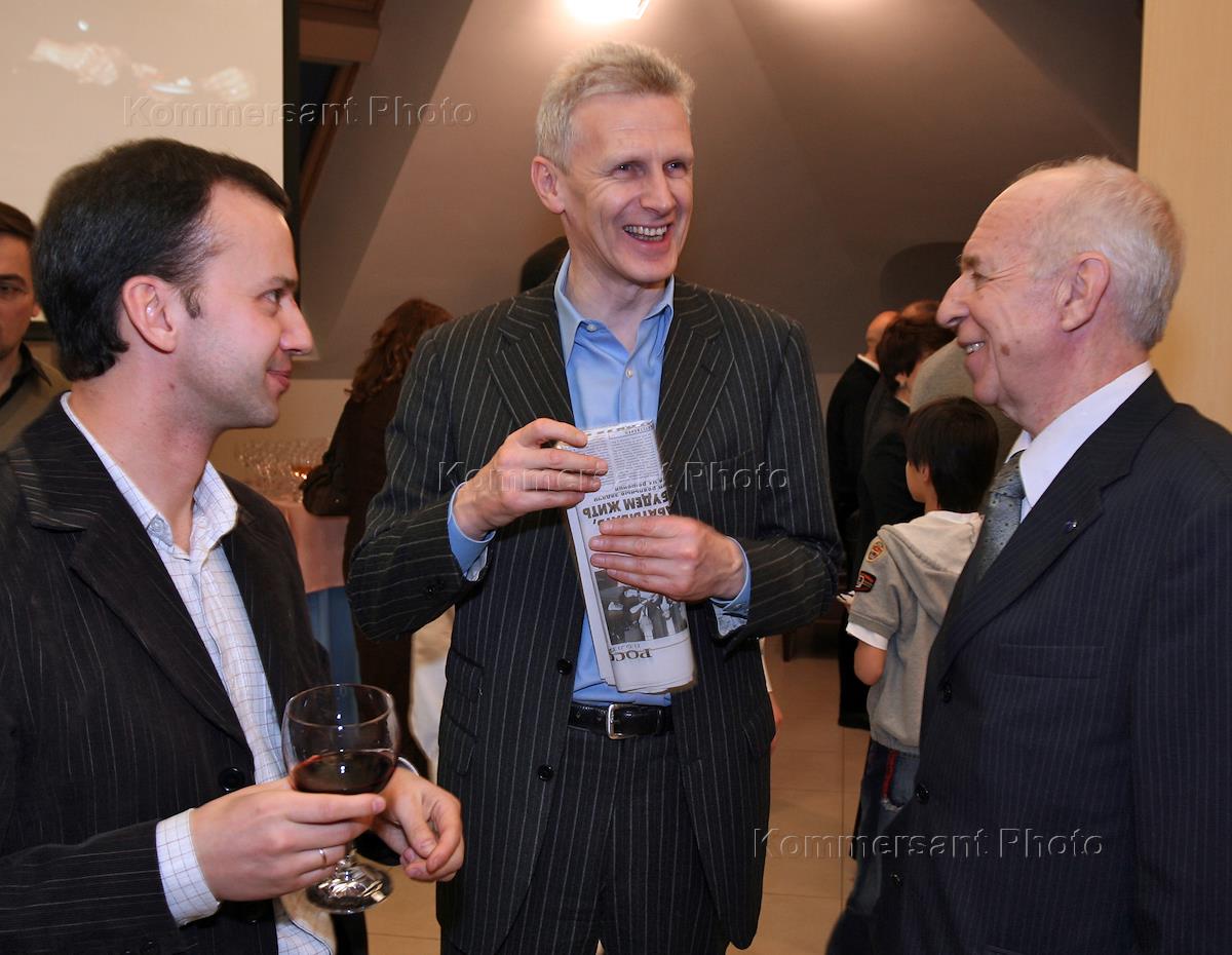 Начальник Экспертного Управления Администрации Президента России Аркадий Дворкович (слева) и министр образования и науки России Андрей Фурсенко (в центре) на заседании Шахматного клуба в Шахматной гостиной имени Владимира Дворковича.