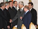 Президент России Владимир Путин (в центре), министр иностранных дел России Сергей Лавров (слева), первый заместитель председателя Правительства России Дмитрий Медведев (второй слева), президент Сербии Борис Тадич (второй справа) и председатель Правительства Сербии Воислав Коштуница (справа) во время деловой встречи в Кремле. Темы встречи - проблема Косово, вопросы сотрудничества на международной арене, обмен мнениями по всему комплексу двусторонних отношений.